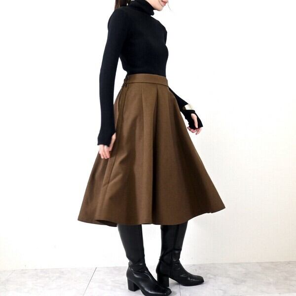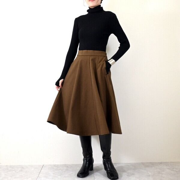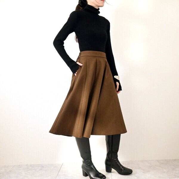 T/Puポーラ素材を使用した、柔らかくて滑らかな手触りが魅力的なミディ丈スカートです。フレアデザインが優雅に広がり、360度どこから見ても美しいシルエットを演出します!
