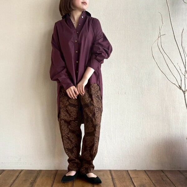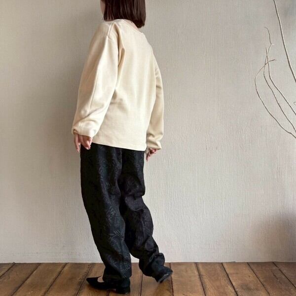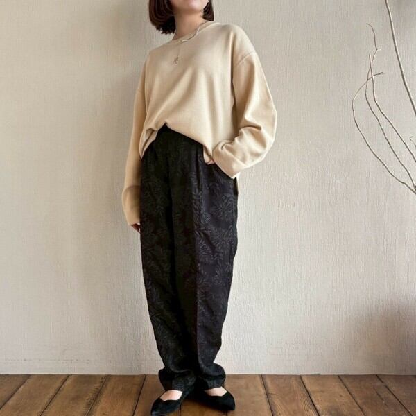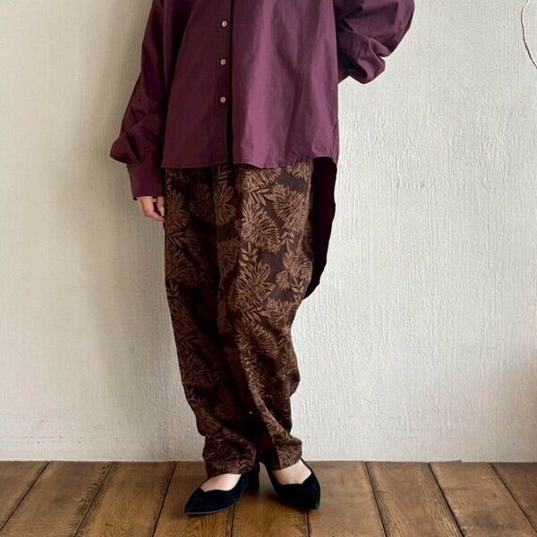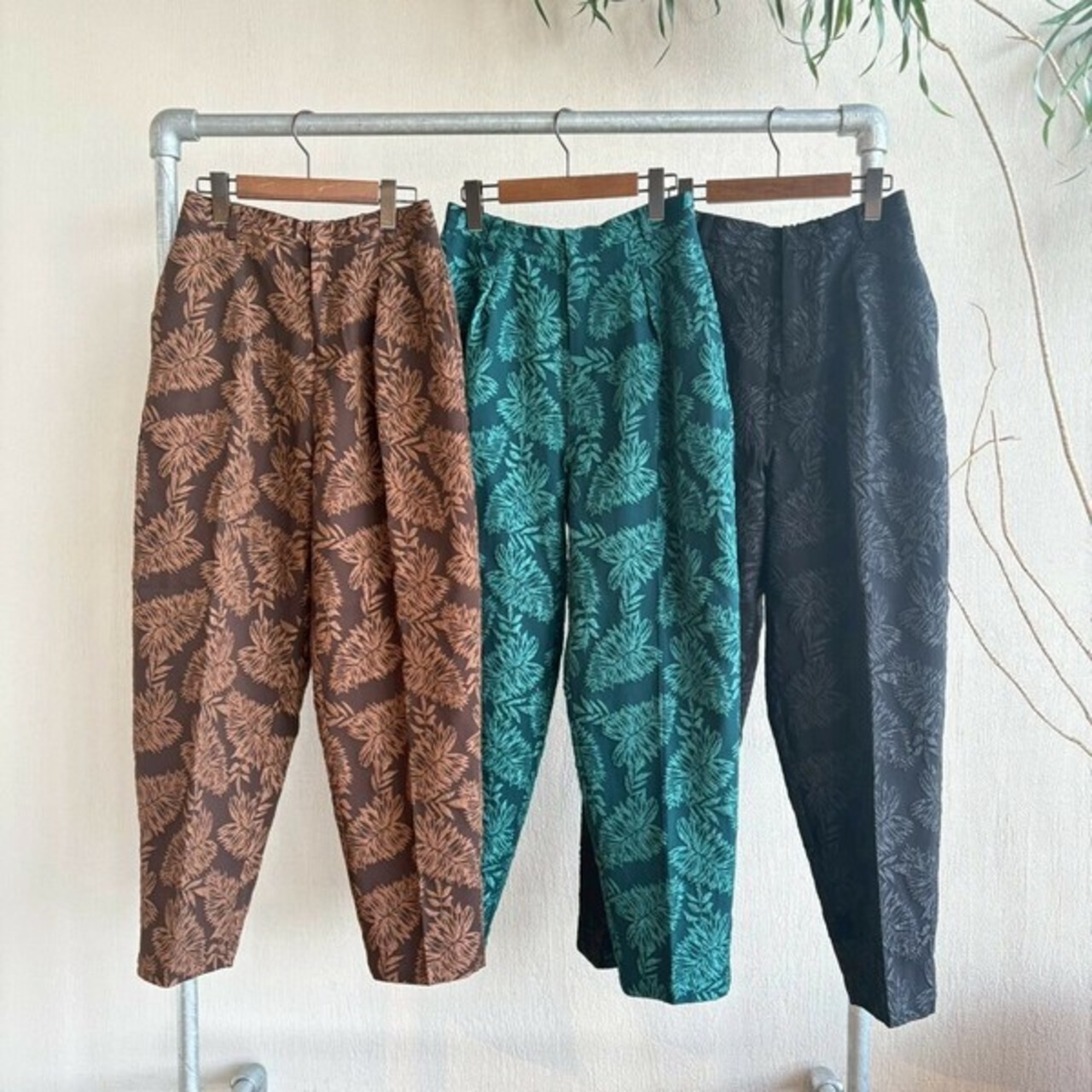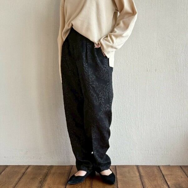 ニュアンスのある抽象リーフ柄のジャガード生地を使用したテーパードパンツ。