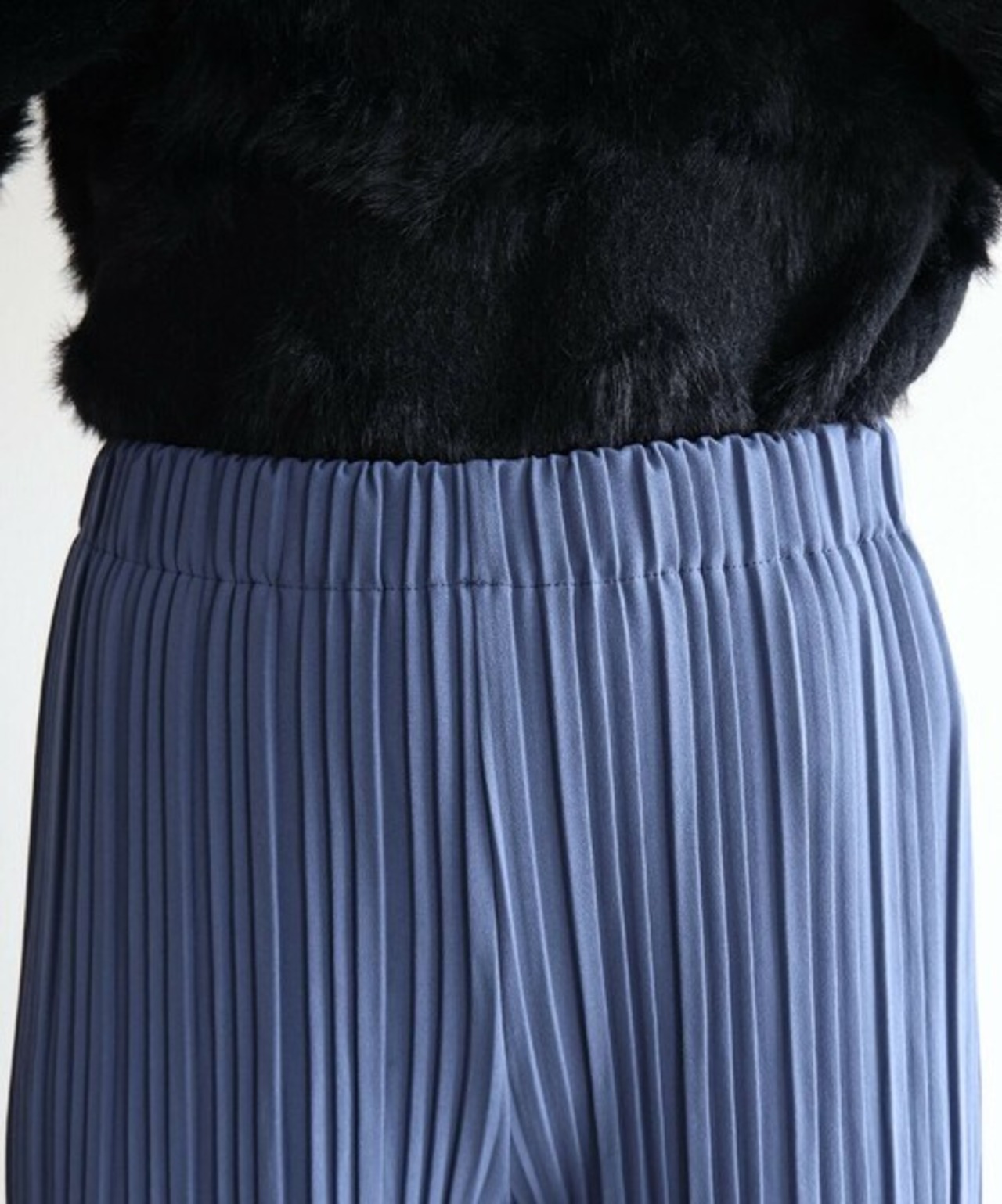 落ち感のあるランダムプリーツが身体のラインを拾わないので