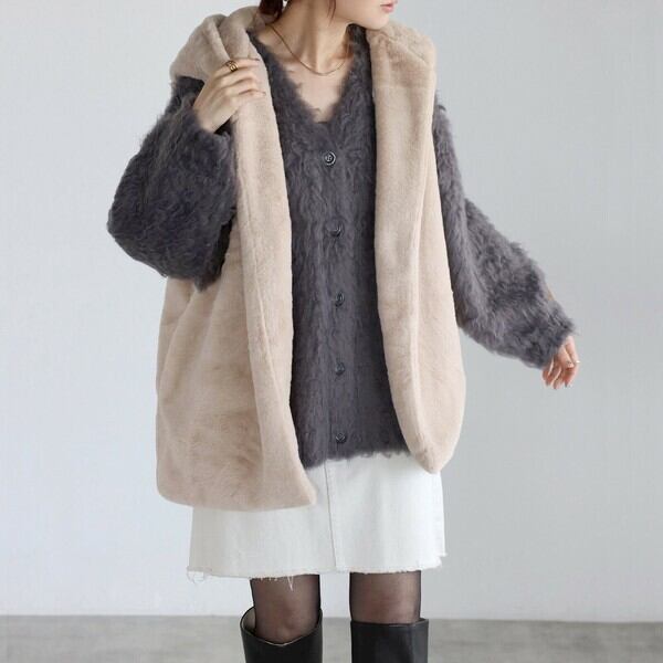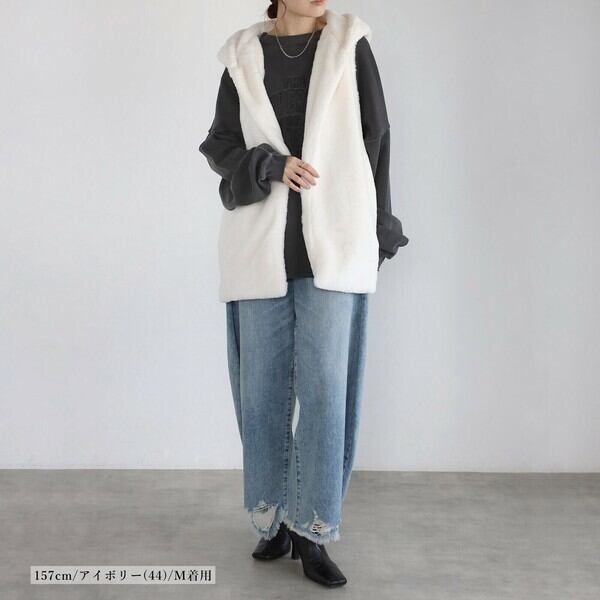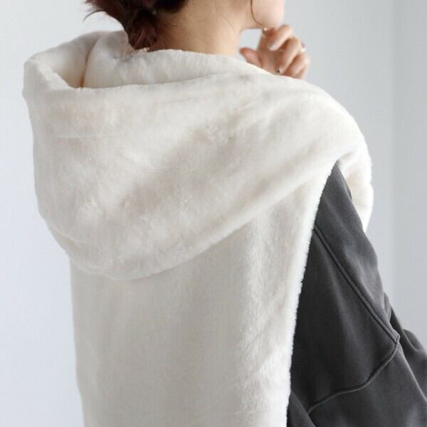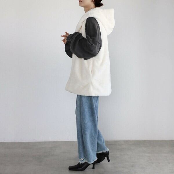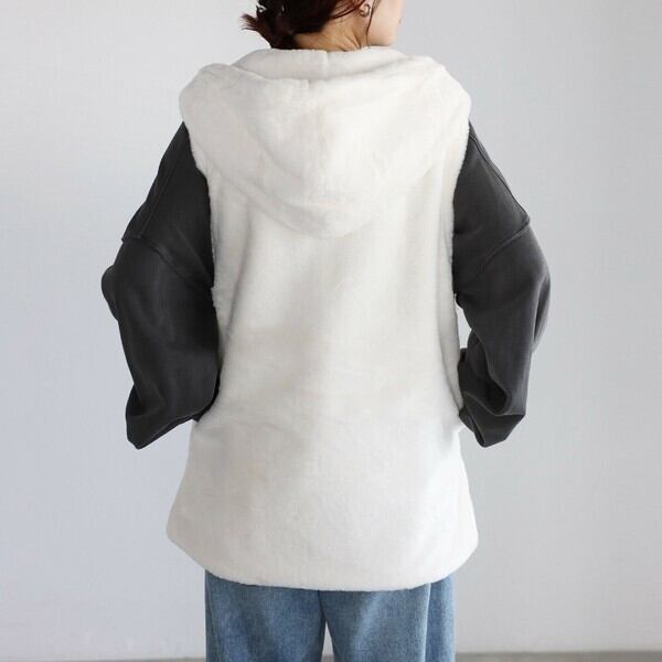 ファーの起毛感がシーズンムードを高めてくれるフード付きベスト。ZIPやボタンのないシンプルデザイン。サイドにはポケット付き。