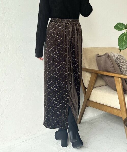 レトロな雰囲気のフラワープリントのベロアロングスカート。
