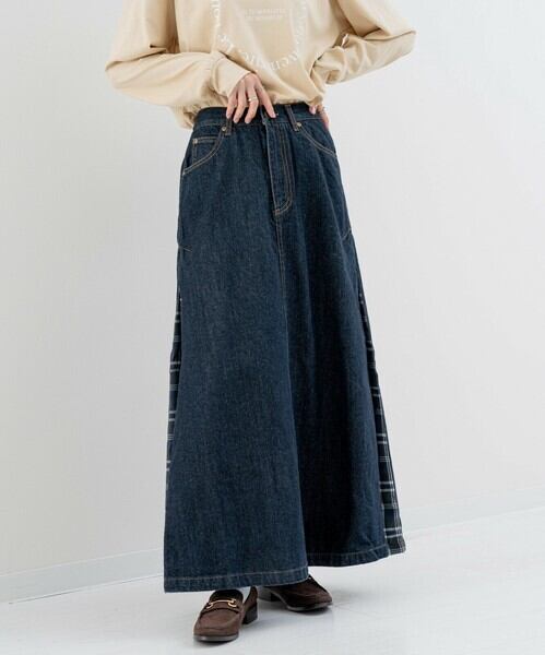 前からみるとベーシックなAラインデニムスカートですが、歩いたときに脇からちらっと見えるチェック柄がアクセントになっています。
