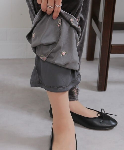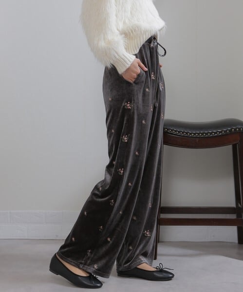 光沢感のあるベロア素材と小花柄の刺繍がトレンドライクなイージーパンツ。