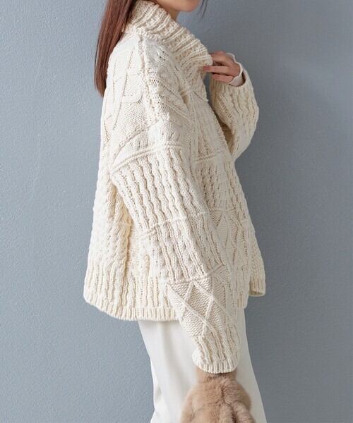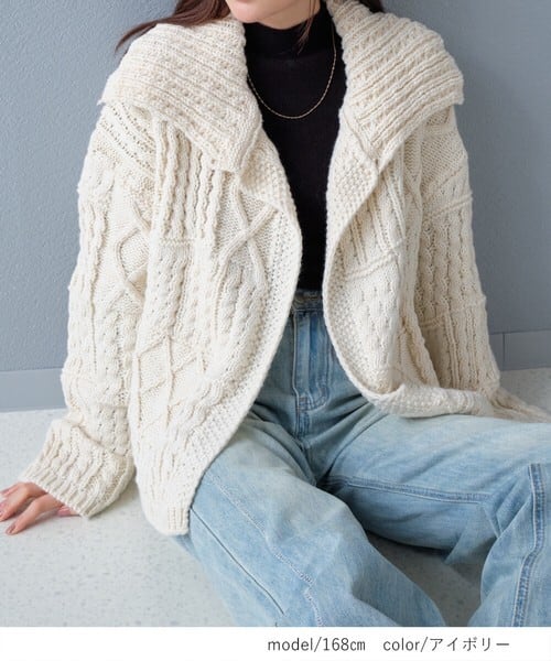 ざっくりとした編み地にビッグカラーデザインでこなれ感のあるスタイリングに。