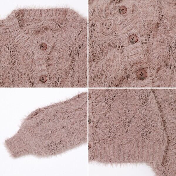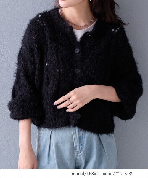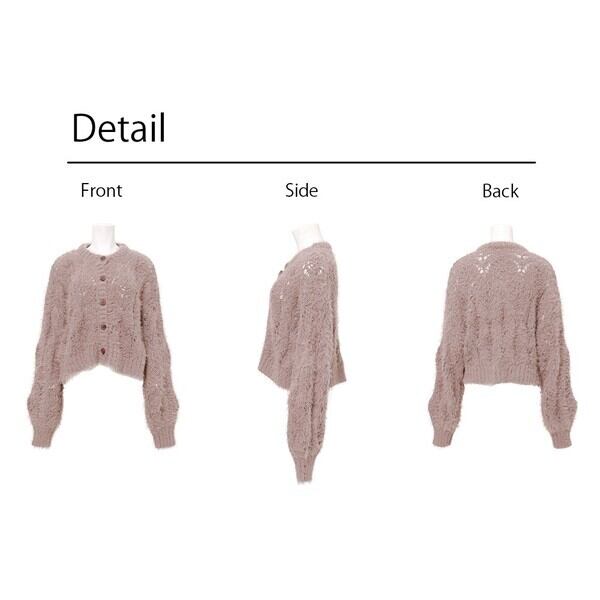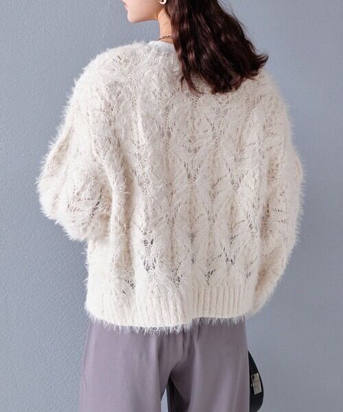 ふんわりと柔らかなモールフェザーヤーンの透かし編みカーディガン。